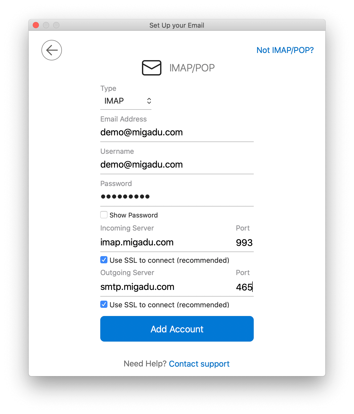 - Incoming Server is imap.migadu.com on port 993. SSL must be enabled.